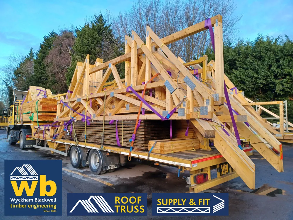 Two full loads of Raised Tie, Duo & Mono Pitch Trusses to create a concealed plant well and Flat Roof, all being loaded 100% On Time In Full, ready for delivery for a new Apartment Block in Bedford.